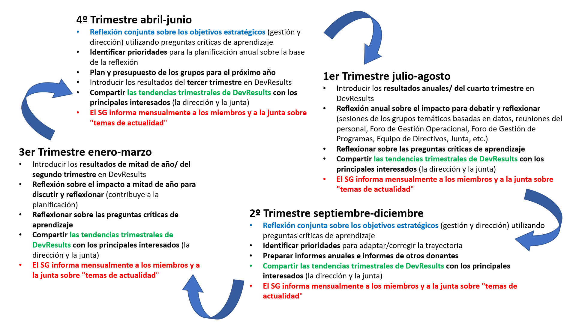 Las herramientas del proyecto y los procesos de recogida, recopilación y análisis de los datos conducir a que los datos se usen con fines de aprendizaje y mejora. Como se indica en este sitio web, se debe fomentar el aprendizaje y la reflexión críticos para contribuir a mejorar la toma de decisiones y a ajustar el proyecto en función de los resultados que se persiguen (p. ej., revisar la Teoría del Cambio). Se sugiere fijar plazos para la presentación de los informes internos clave, puntos de reflexión, así como otros hitos de presentación de informes (a donantes o partes interesadas, por ejemplo).